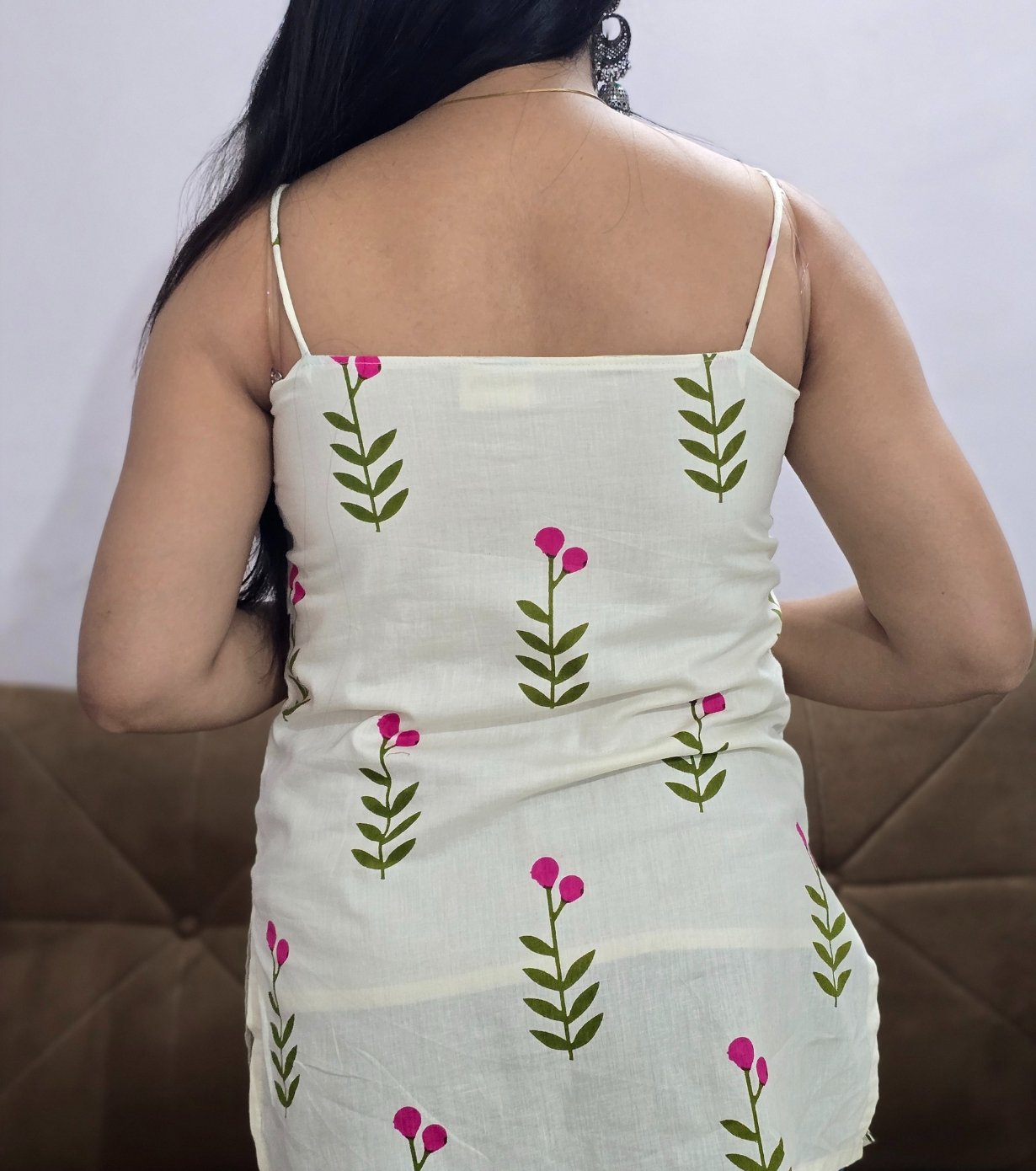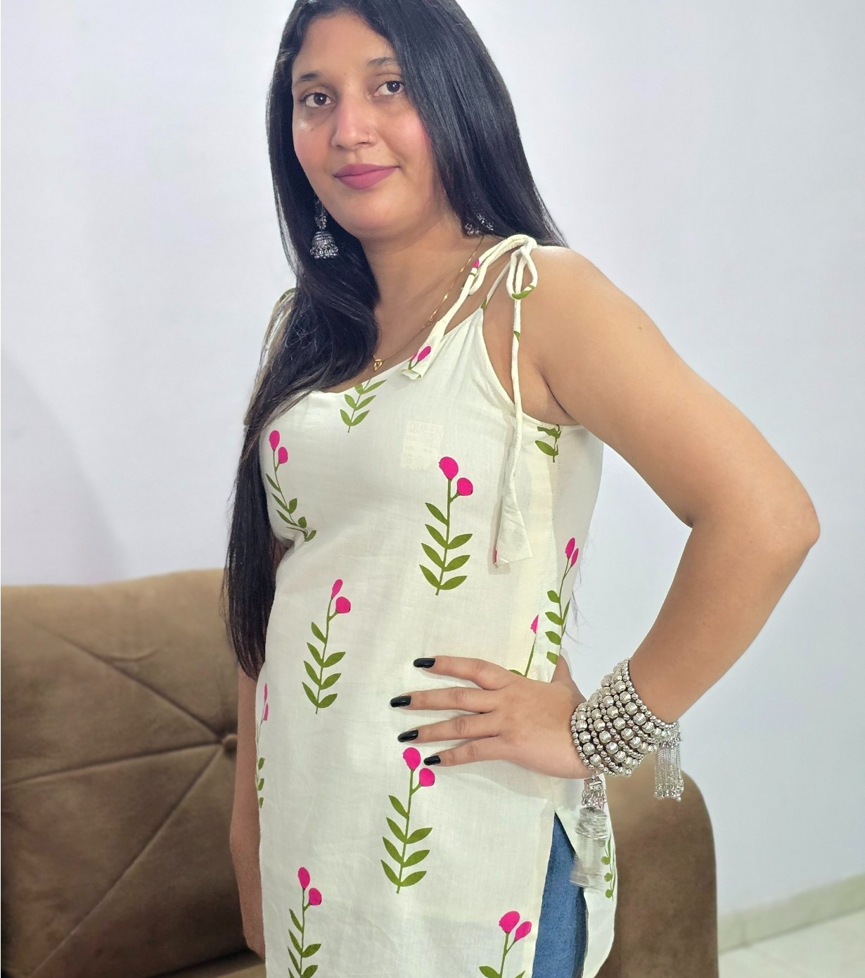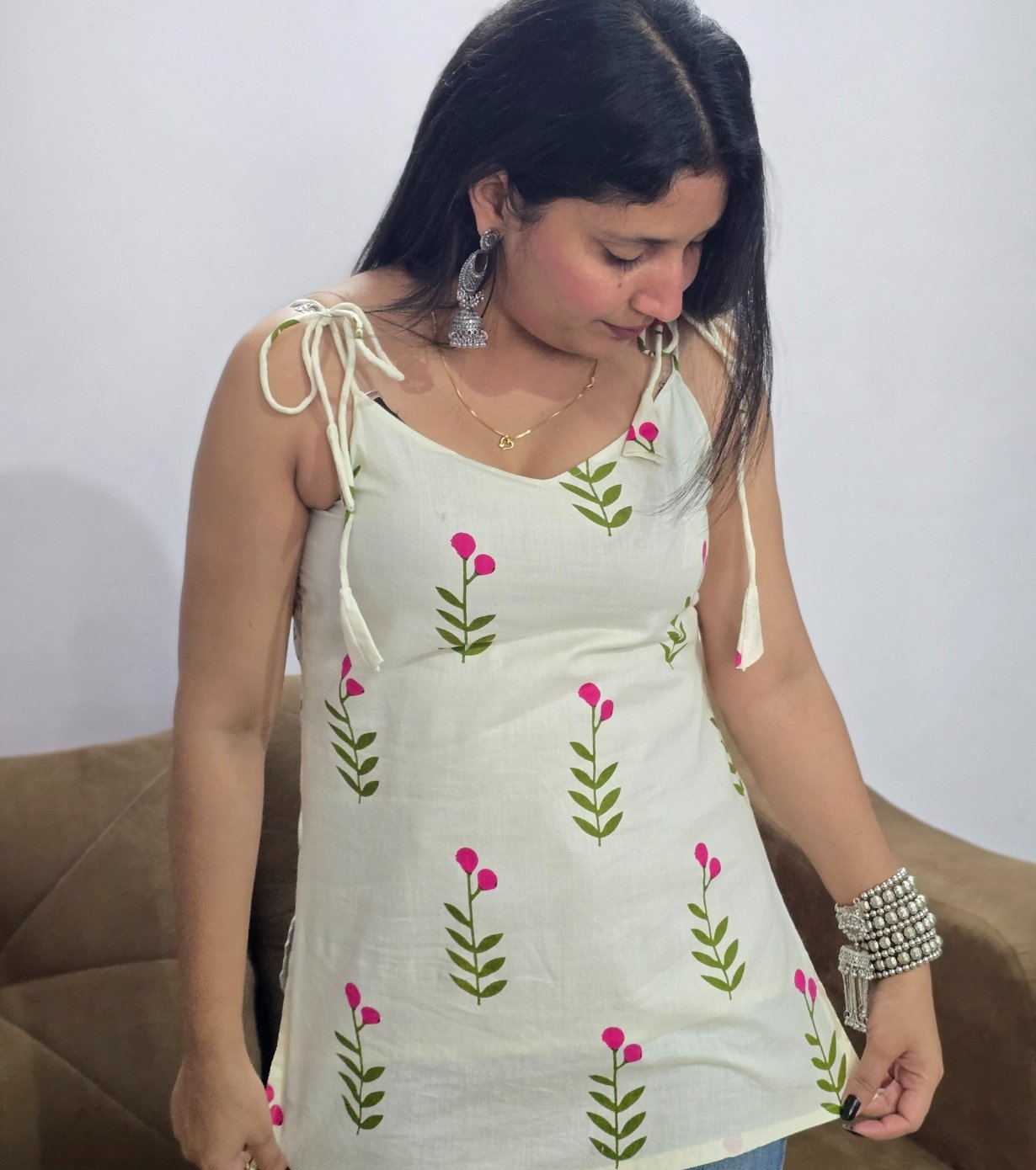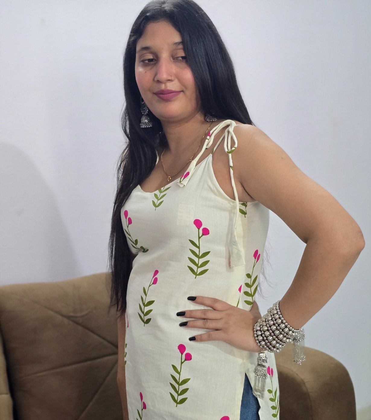 Light, lovely, and made for comfort. Crafted from soft, breathable cotton, this sleeveless kurti features delicate pink buds and green stems, with a playful shoulder tie. Perfect for warm days and effortless style.
