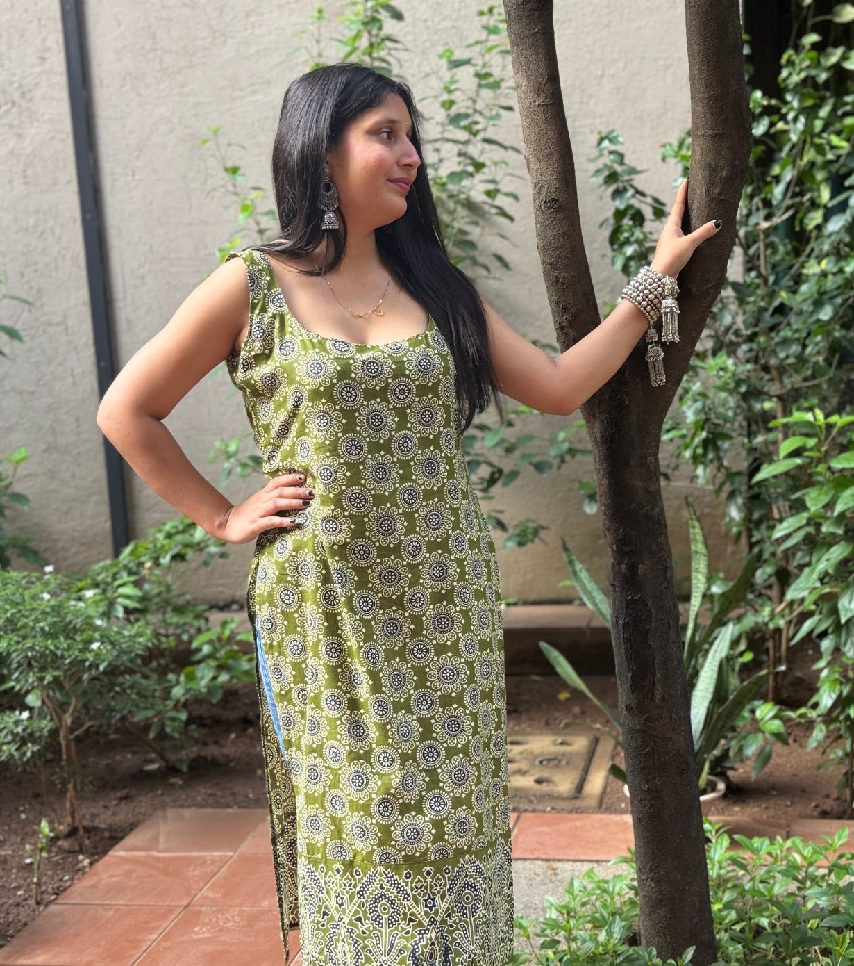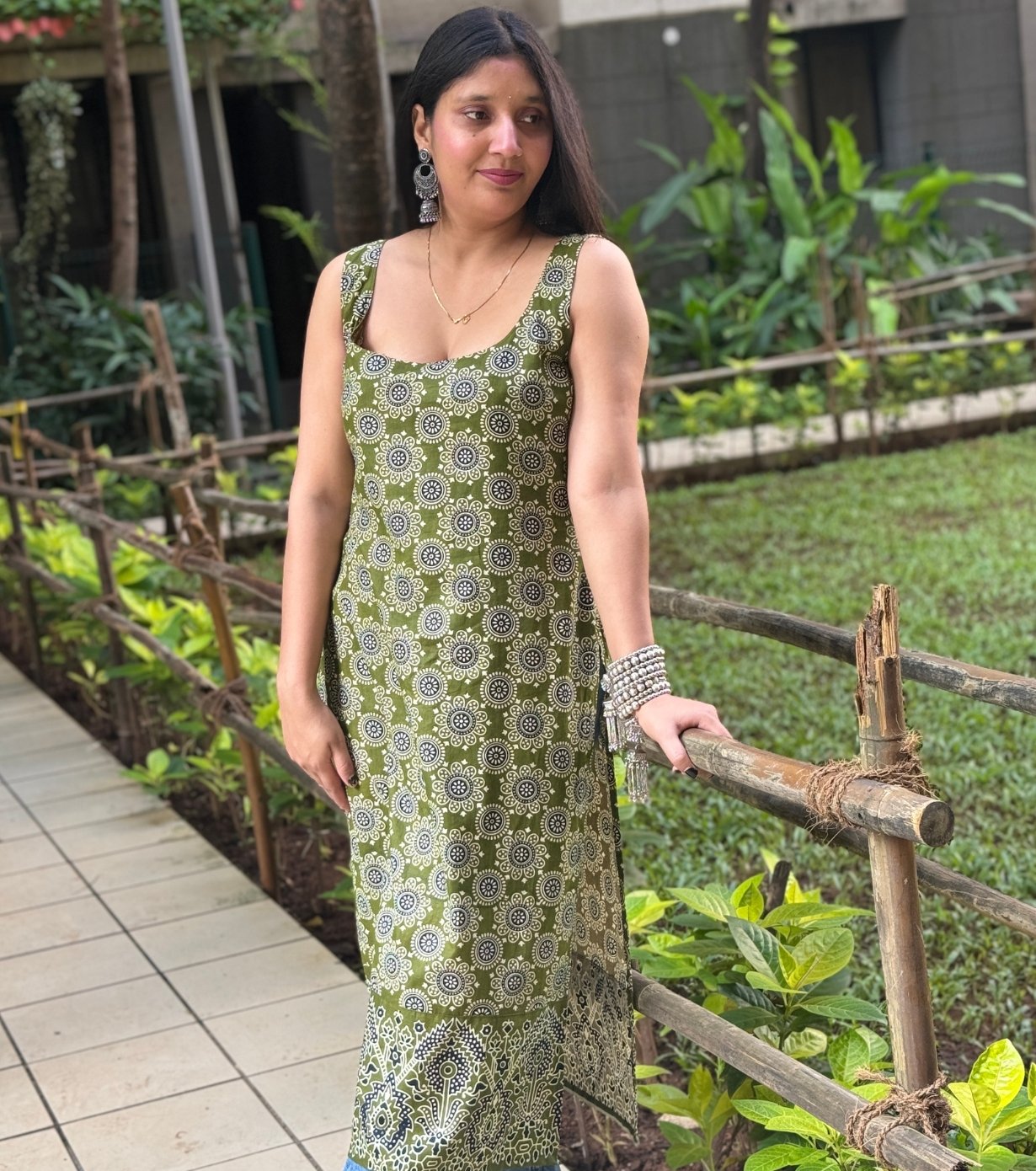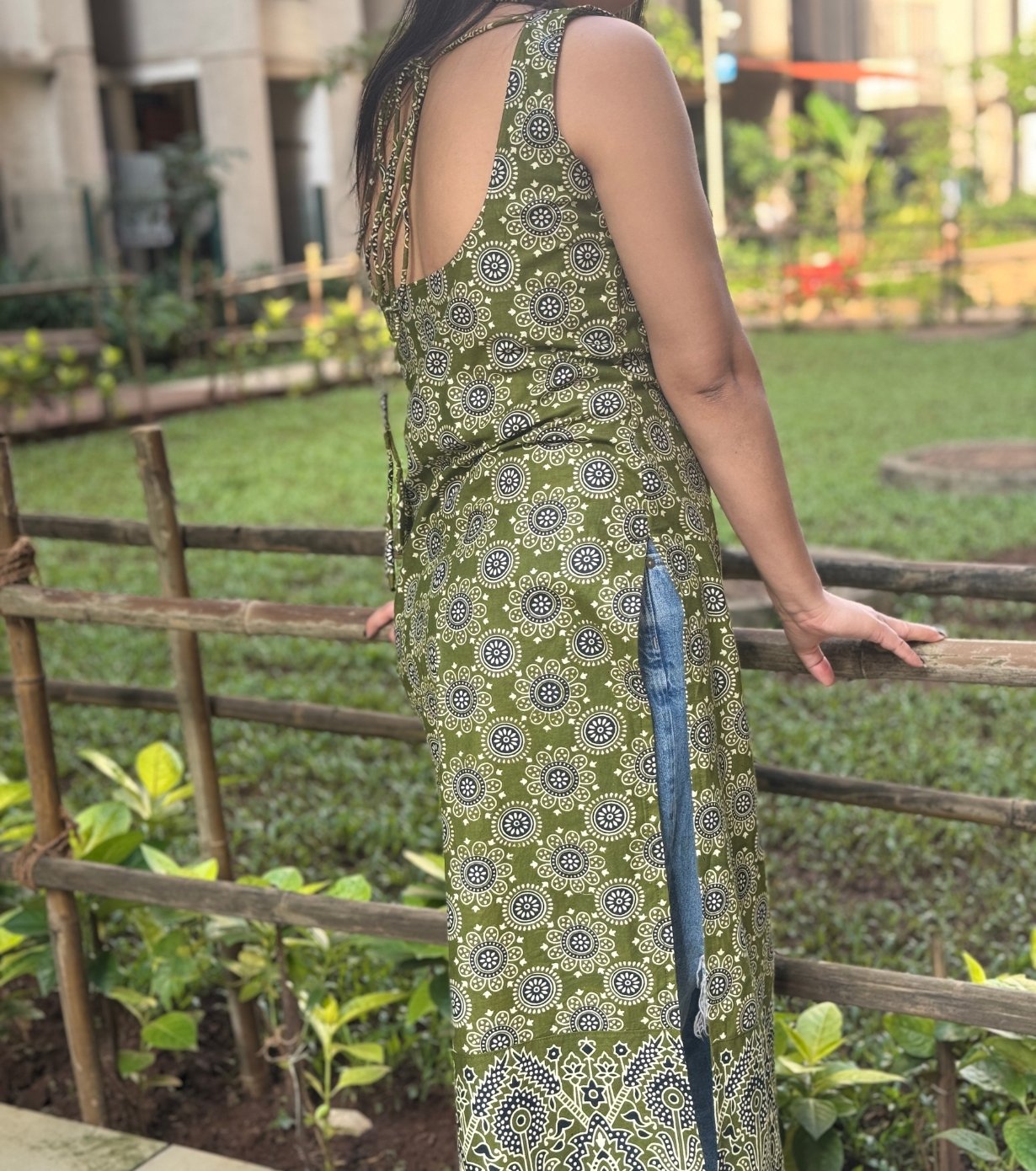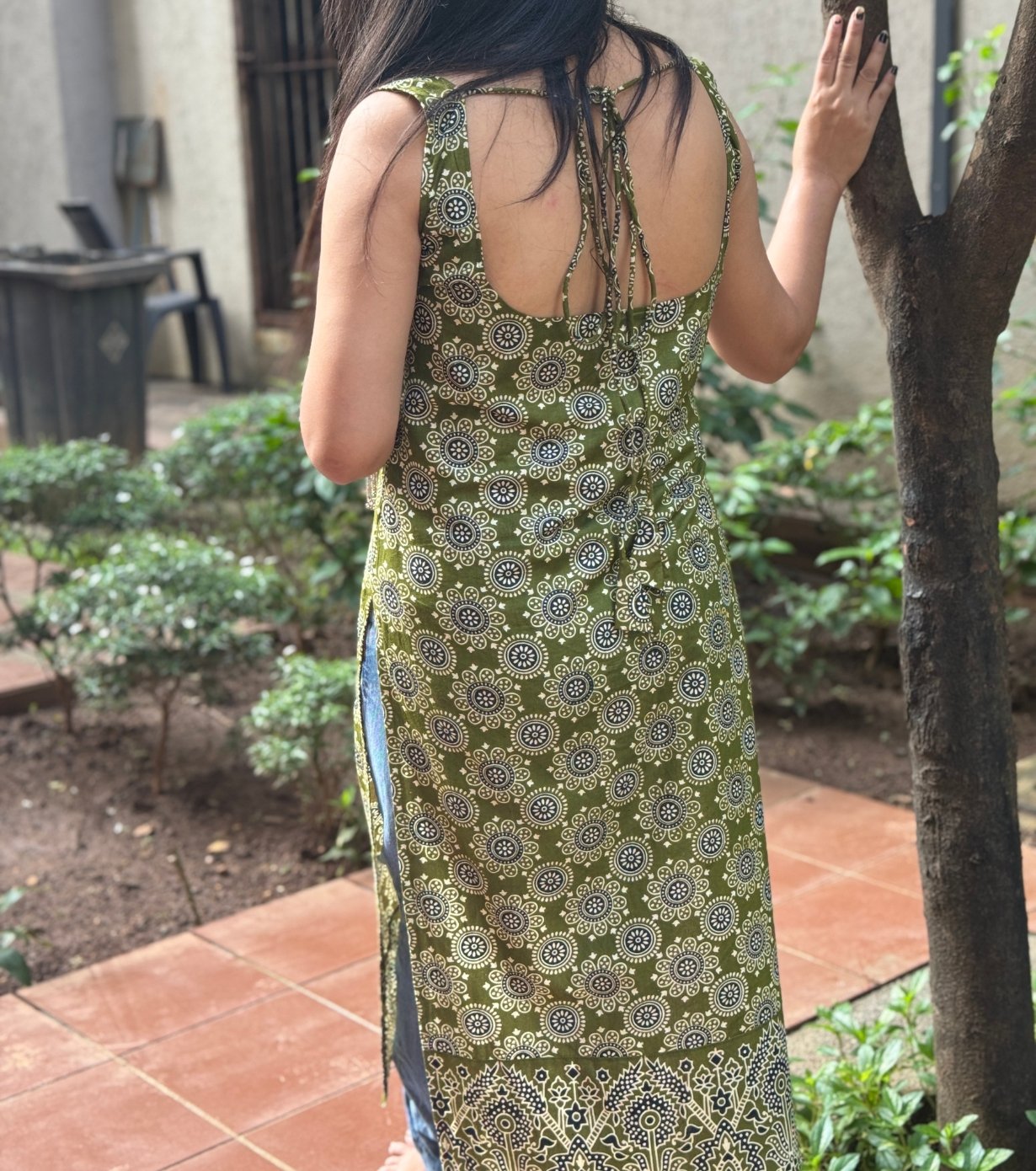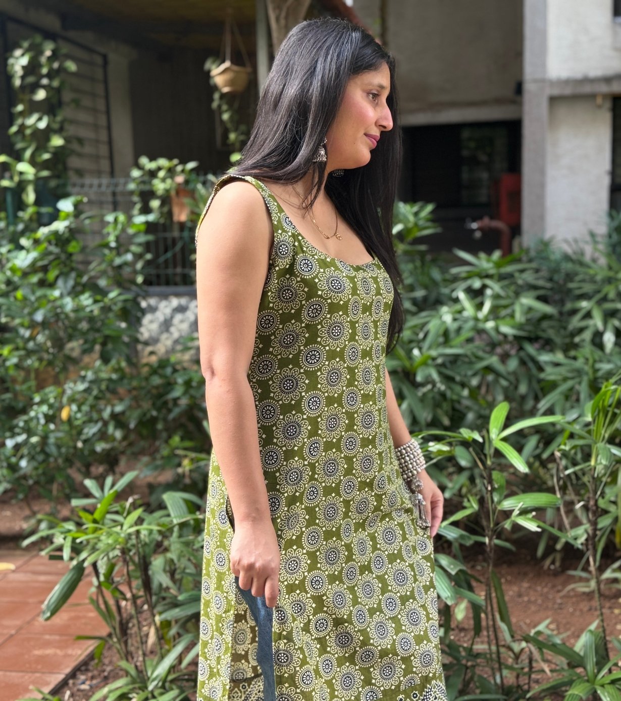 This sleeveless long kurti is made from soft, breathable cotton that feels light and easy on the skin. It features a rich green base with delicate circular and floral patterns in subtle tones that blend beautifully with the fabric. The design is graceful and thoughtfully detailed, making it a comfortable yet elegant choice for everyday wear or special moments.