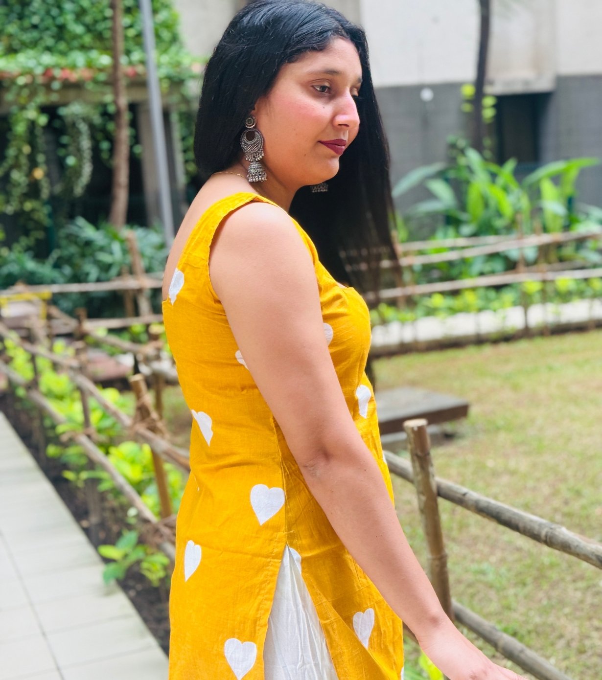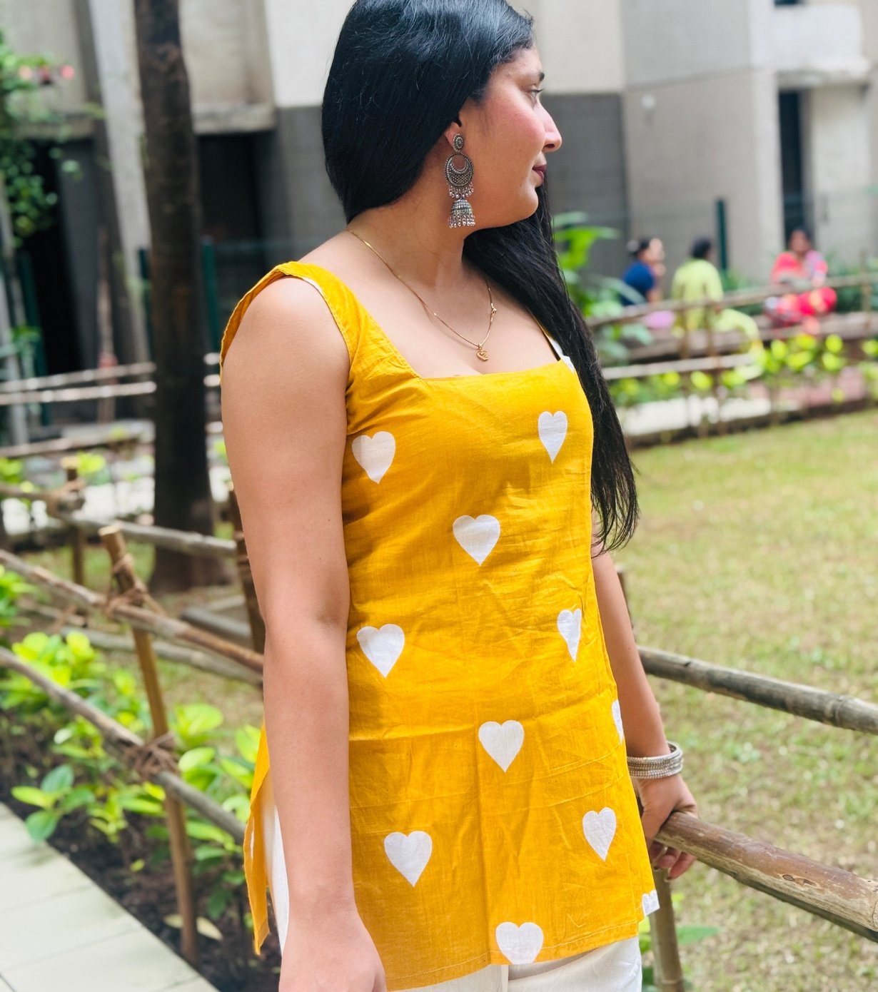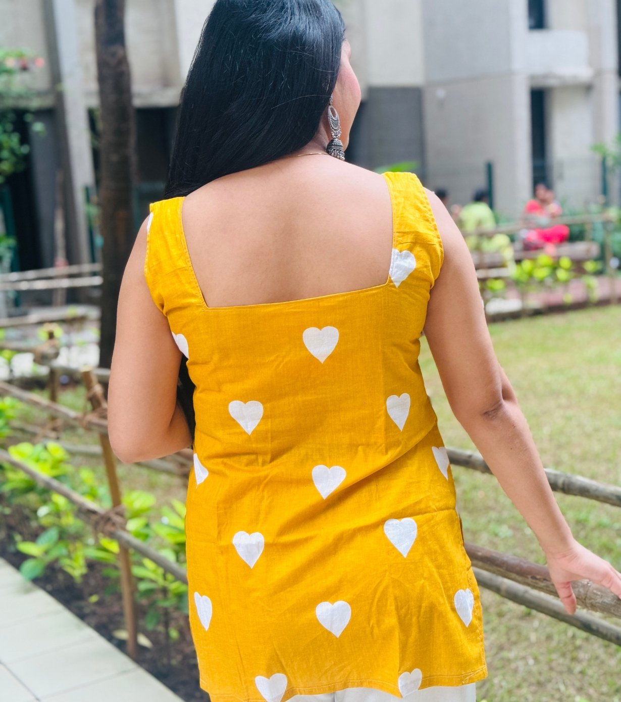 Brighten your day with the Heartlight kurti—a cheerful blend of comfort and charm. Crafted from soft, breathable cotton, this sleeveless piece features a square neckline and playful white heart motifs that radiate joy. The relaxed fit and airy fabric make it perfect for warm weather and all-day wear.