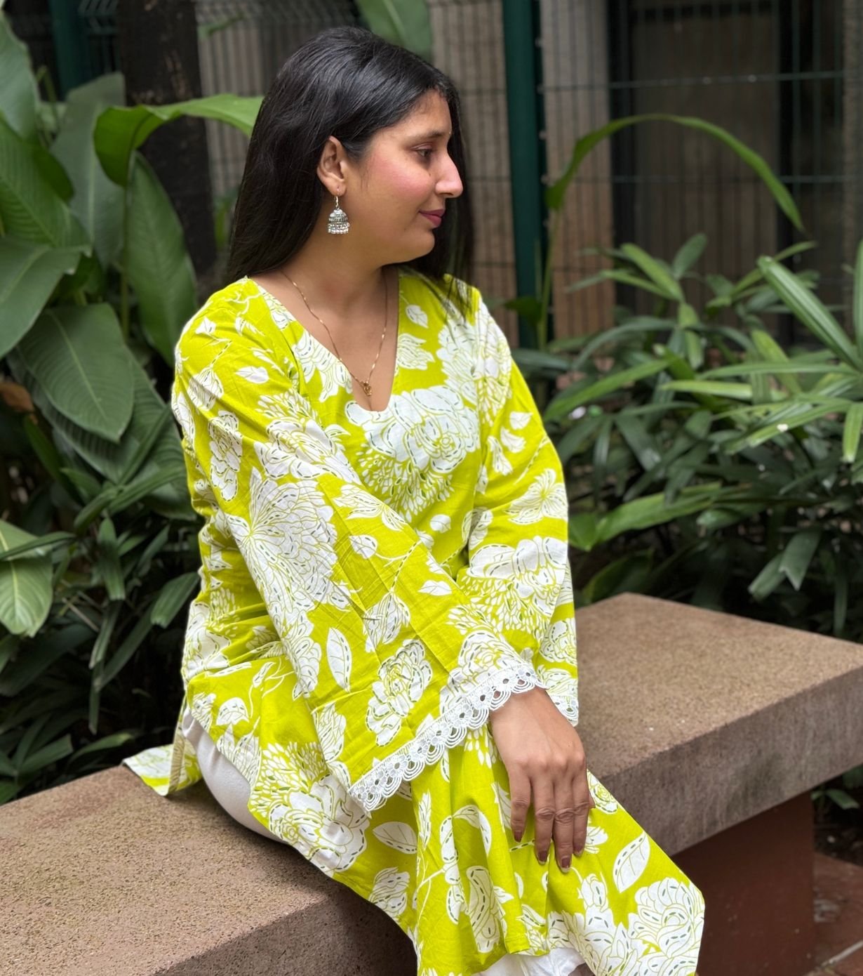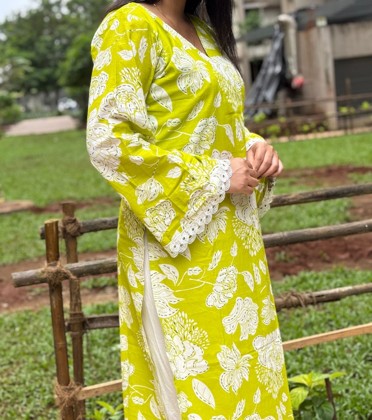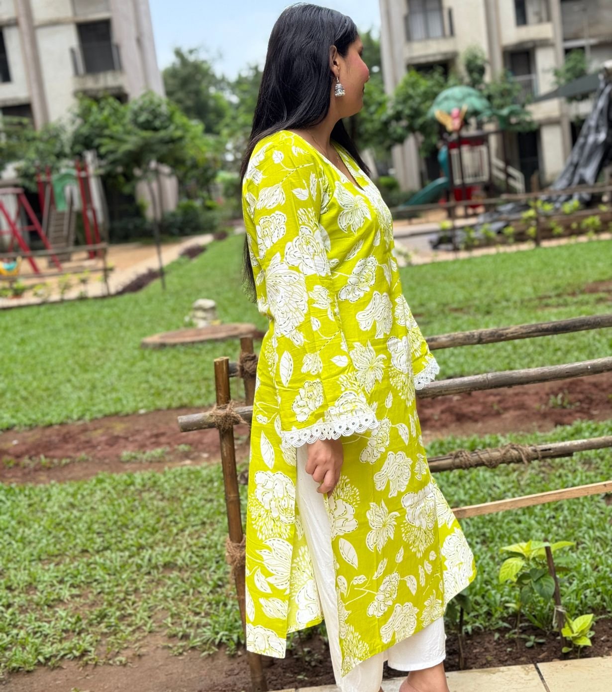 Brighten up your wardrobe with this lime-green floral long kurti from Clothshe. Crafted from soft, breathable cotton, it offers all-day comfort with effortless style. The kurti features a charming white floral print that adds a fresh and feminine touch. Its V-neckline and bell sleeves detailed with delicate lace make it perfect for both casual outings and festive gatherings. Pair it with white palazzos or leggings for a chic, graceful look.