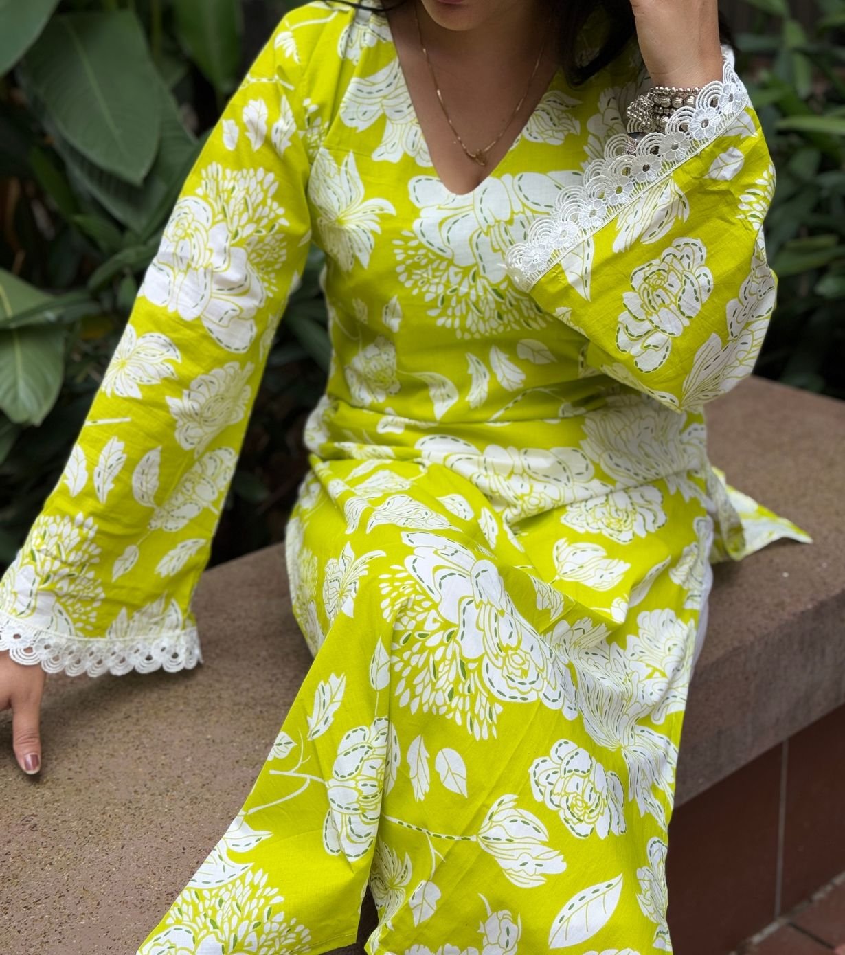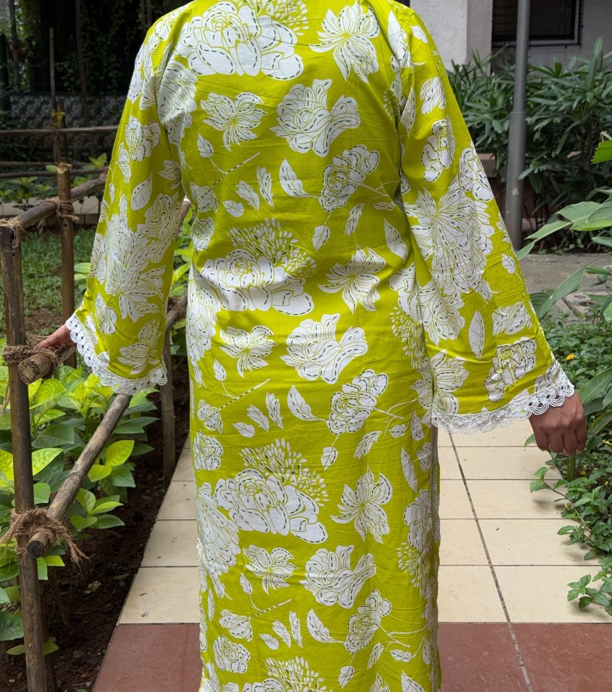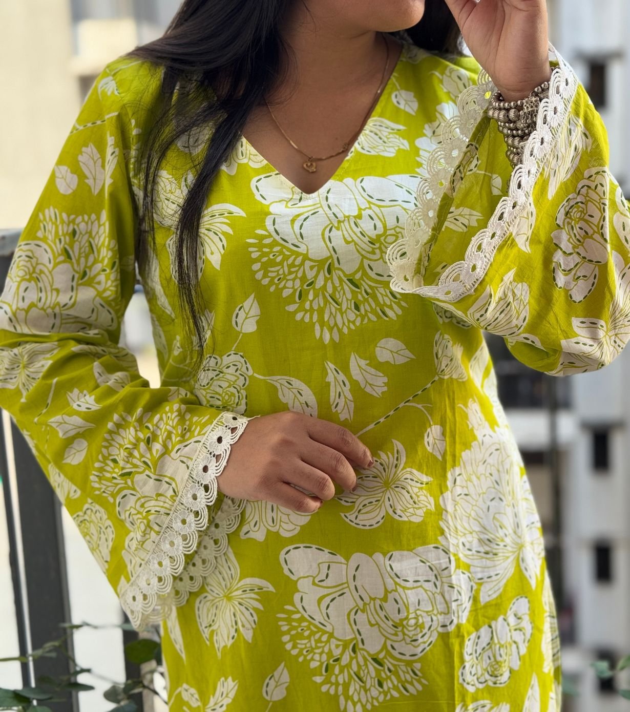 Brighten up your wardrobe with this lime-green floral long kurti from Clothshe. Crafted from soft, breathable cotton, it offers all-day comfort with effortless style. The kurti features a charming white floral print that adds a fresh and feminine touch. Its V-neckline and bell sleeves detailed with delicate lace make it perfect for both casual outings and festive gatherings. Pair it with white palazzos or leggings for a chic, graceful look.