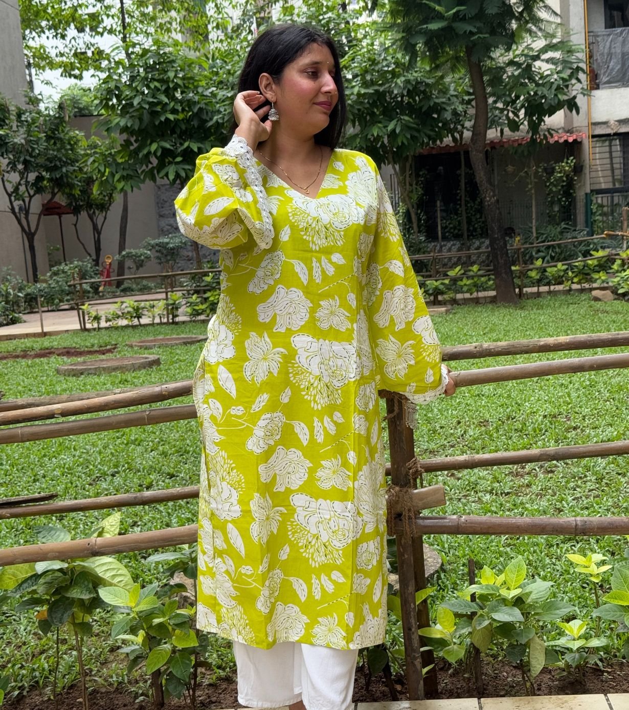 Lime Leaf – Green Floral Bell Sleeves Long kurti by Clothshe