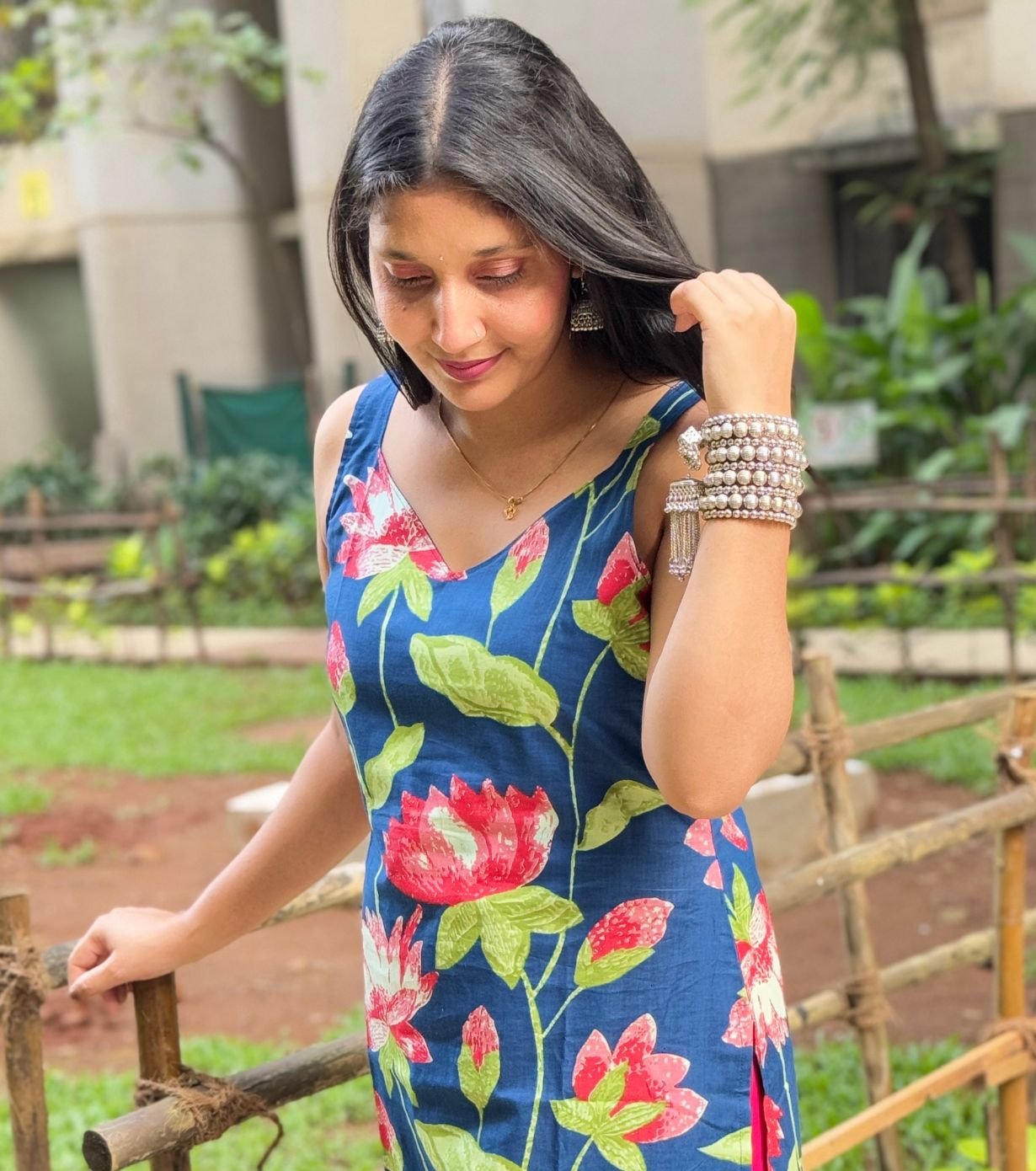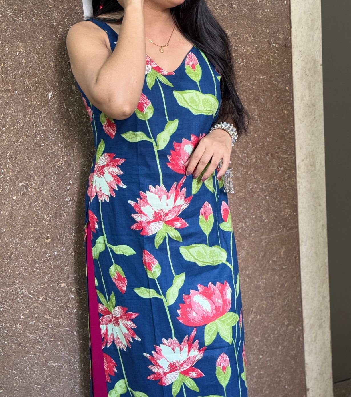Step into effortless elegance with this navy blue sleeveless long kurti from Clothshe. Adorned with bold lotus floral prints in shades of pink and green, this kurti blends tradition with a modern edge. Crafted from soft, breathable cotton, it’s perfect for sunny days and casual outings. The V-neckline and straight-cut silhouette flatter every body type, while the vibrant colors add a refreshing charm. Pair it with contrast pink or white pants for a chic, statement look.