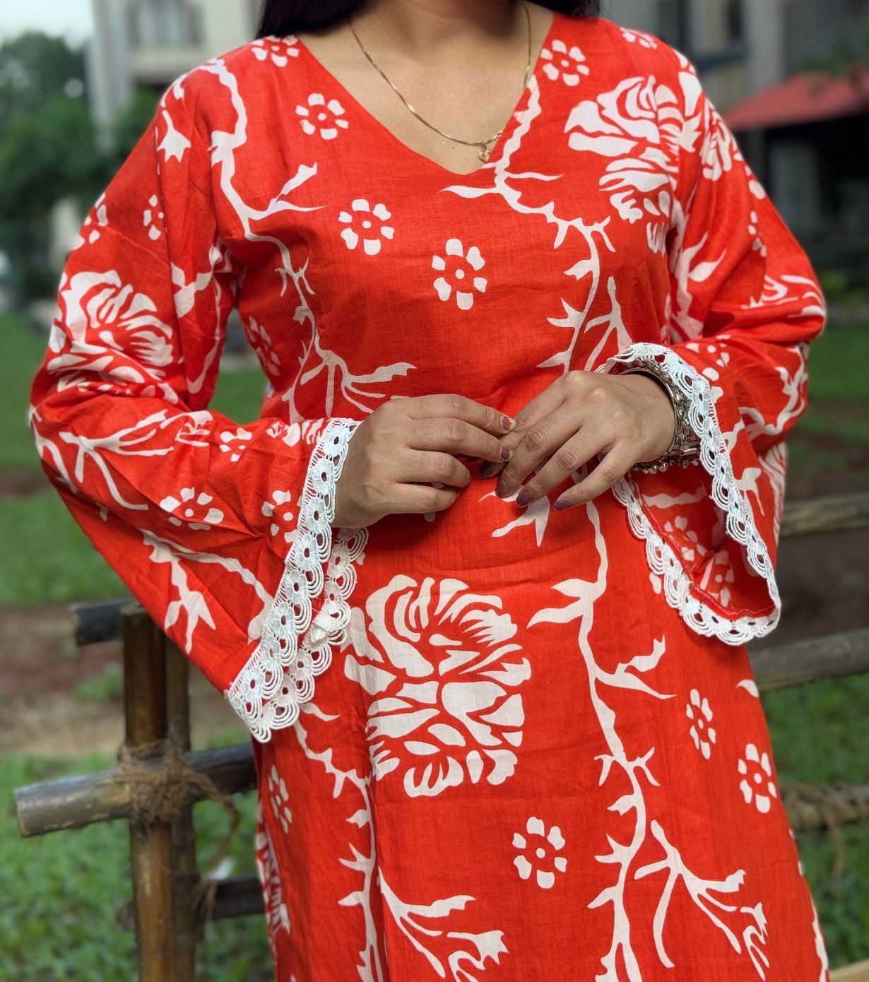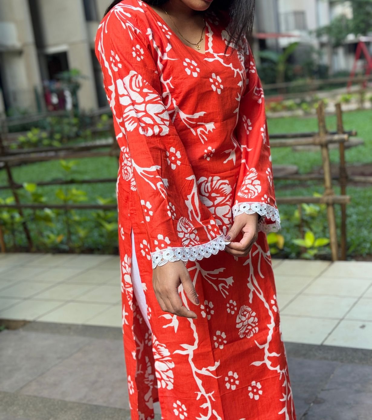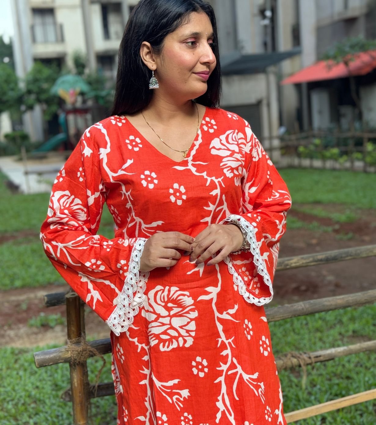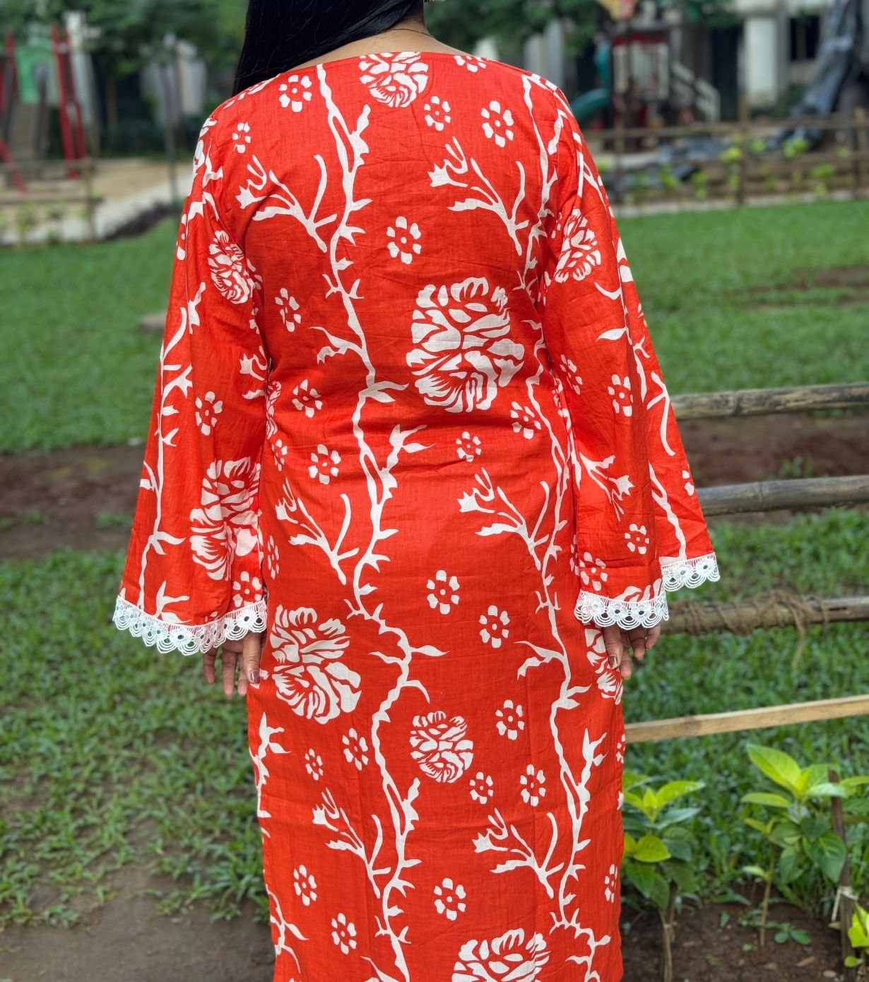 Add a pop of brightness to your wardrobe with this vibrant orange floral long kurti from Clothshe. Made from soft, breathable cotton, it keeps you comfortable and stylish all day long. The kurti features white floral prints that beautifully complement the lively orange base, giving it a cheerful and elegant charm. The V-neckline and bell sleeves enhanced with lace detailing add a touch of sophistication and femininity. Perfect for casual outings, festive gatherings, or a refreshing daytime look.