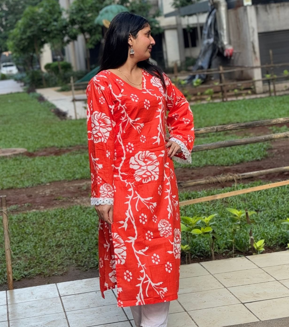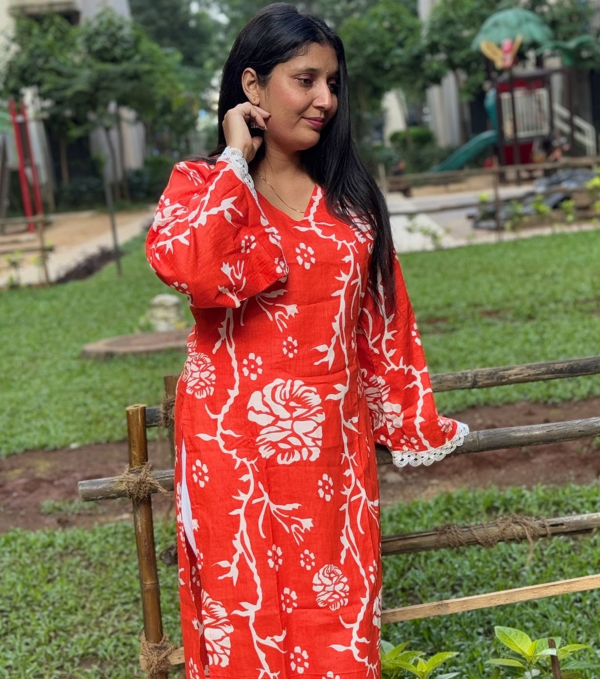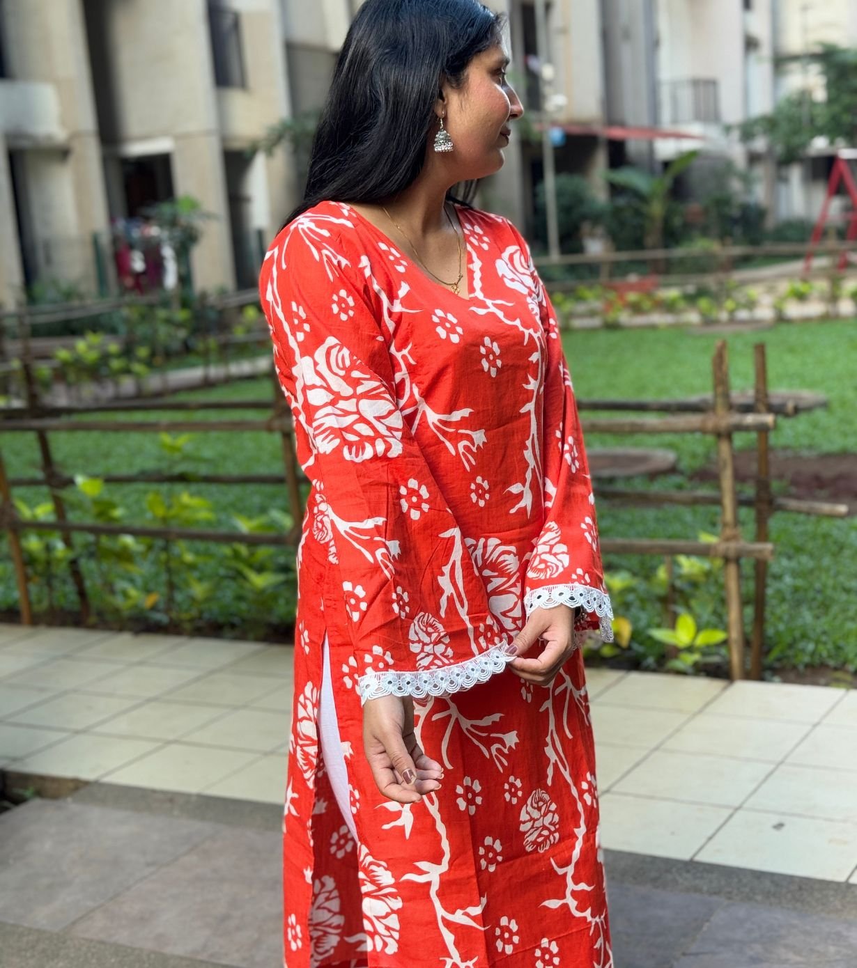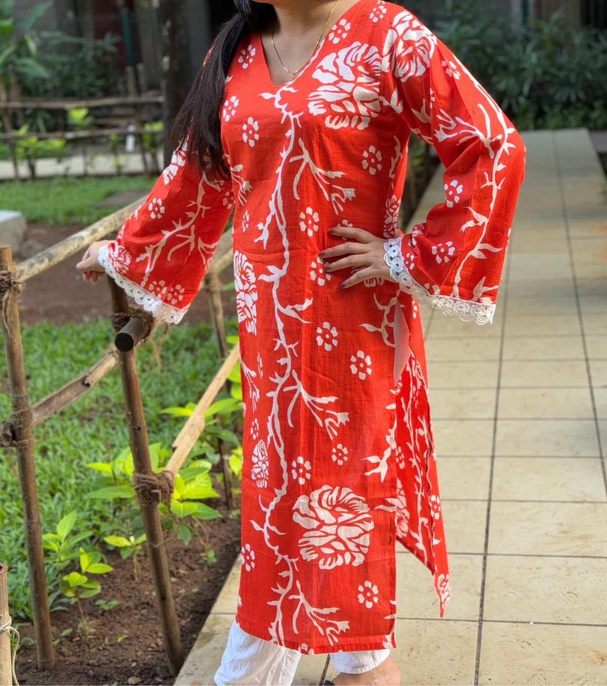 Add a pop of brightness to your wardrobe with this vibrant orange floral long kurti from Clothshe. Made from soft, breathable cotton, it keeps you comfortable and stylish all day long. The kurti features white floral prints that beautifully complement the lively orange base, giving it a cheerful and elegant charm. The V-neckline and bell sleeves enhanced with lace detailing add a touch of sophistication and femininity. Perfect for casual outings, festive gatherings, or a refreshing daytime look.