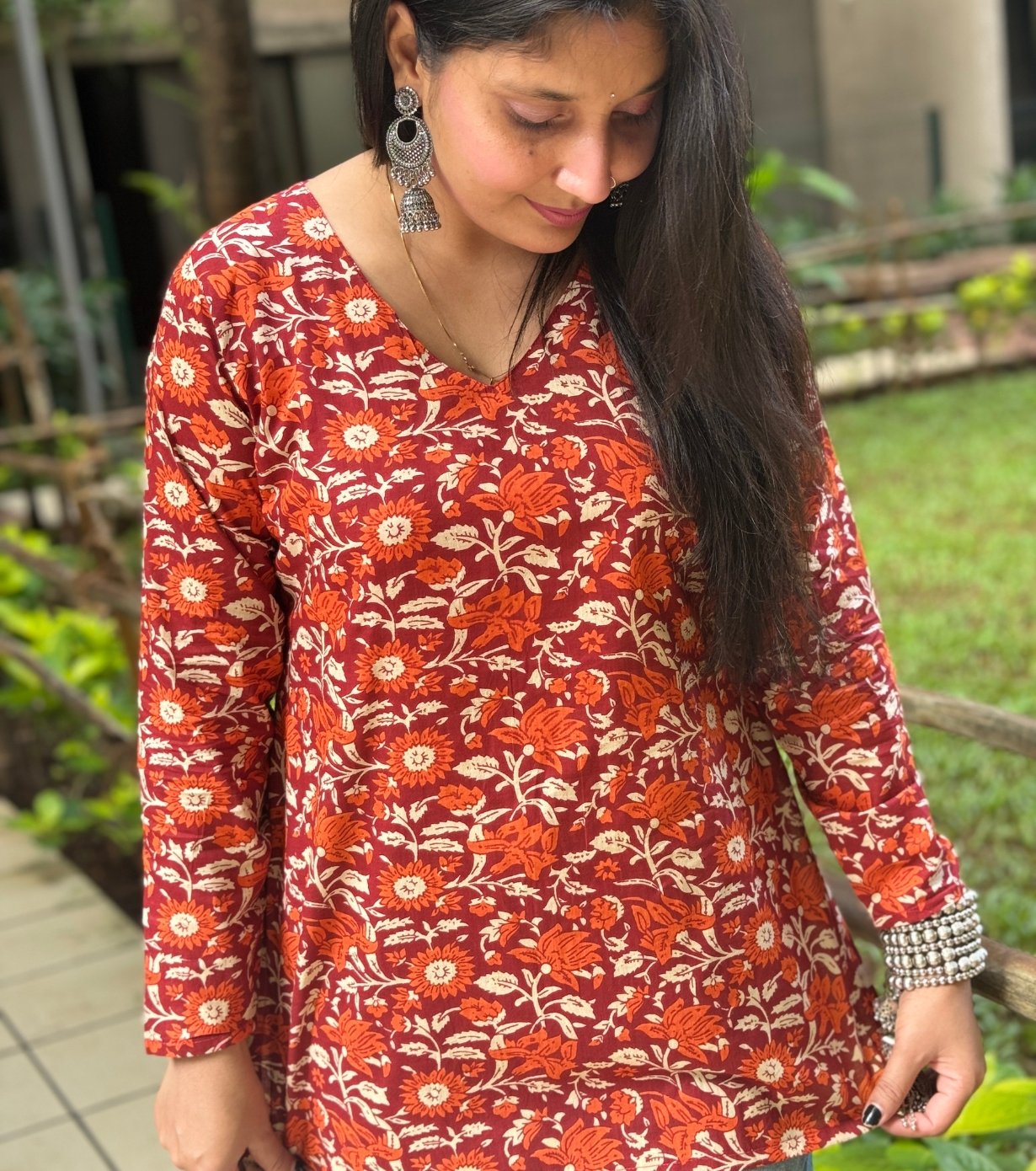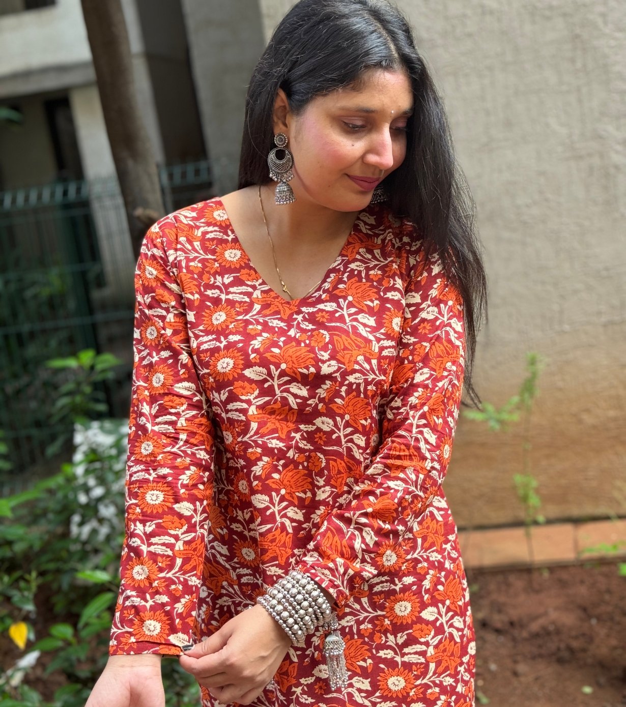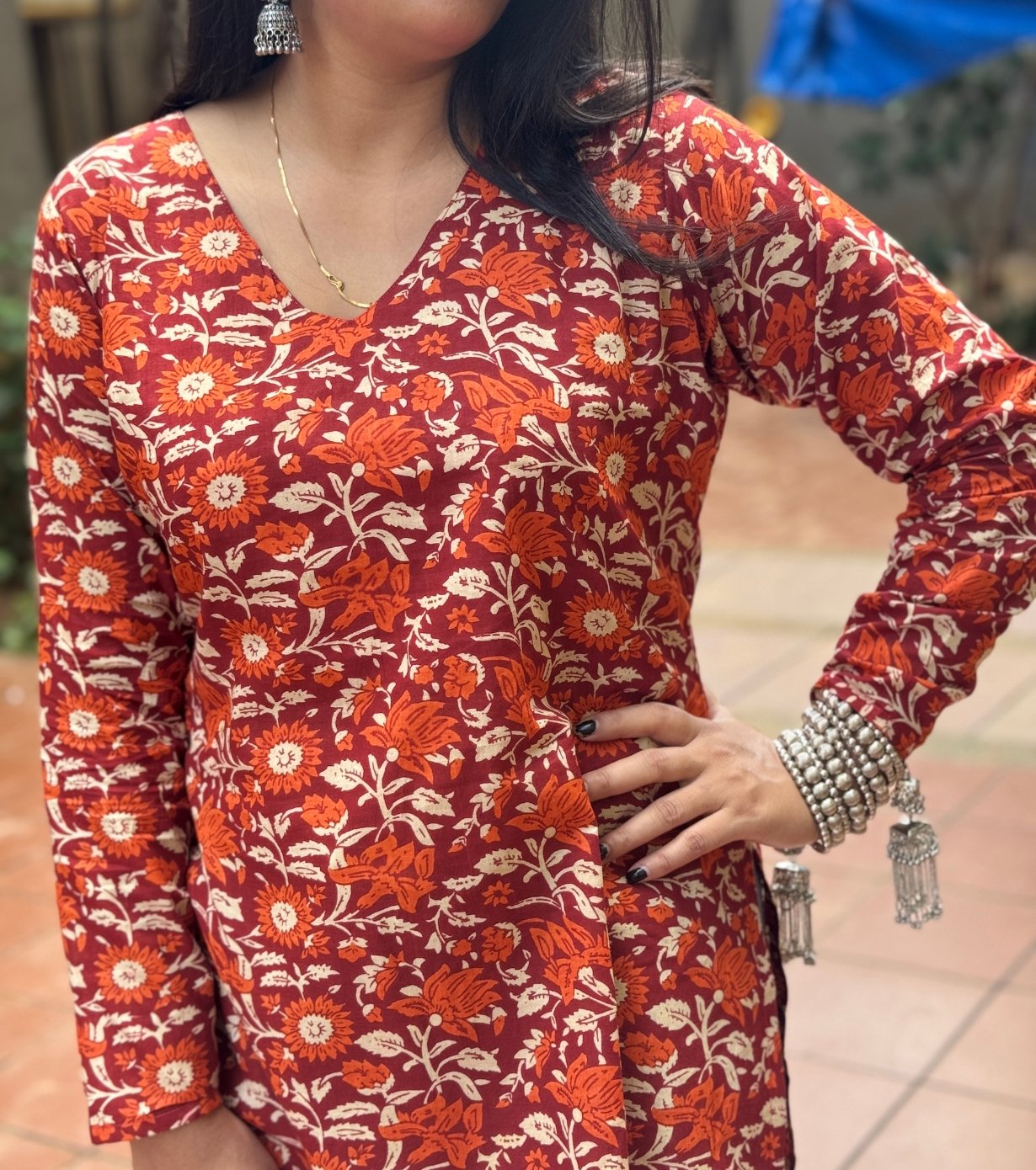 Featuring a V-neckline and full sleeves, the kurti offers a relaxed yet elegant fit. The floral print in warm tones of orange, red, and cream adds a traditional touch, making it suitable for casual outings or festive occasions.