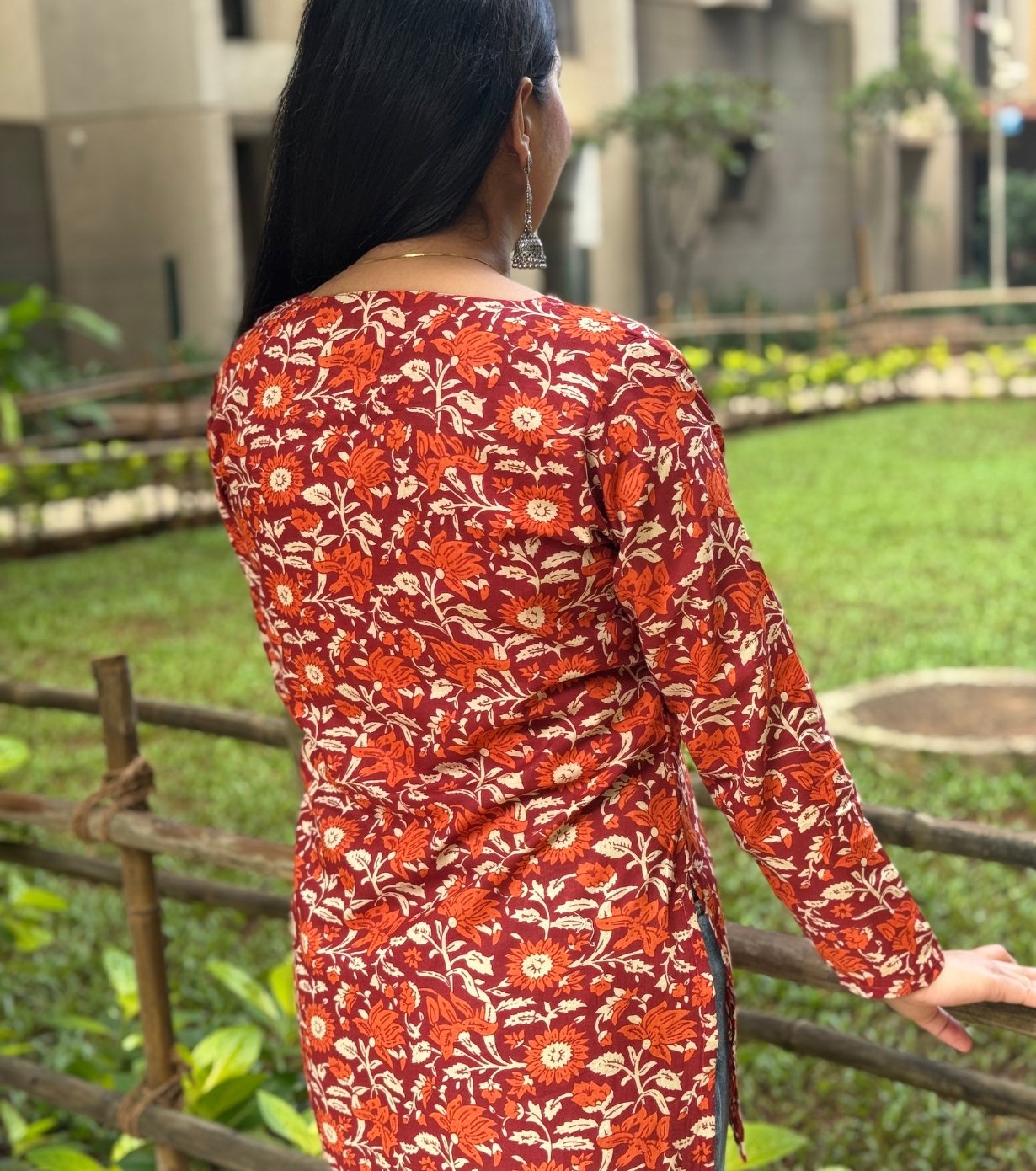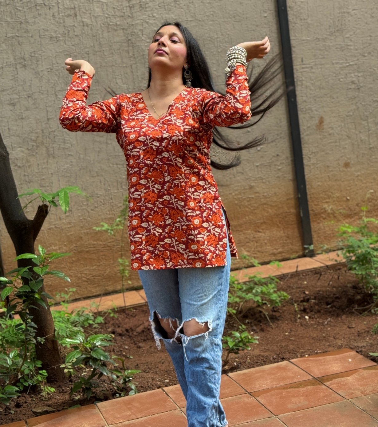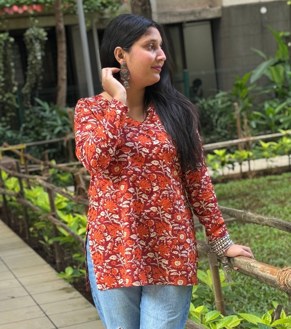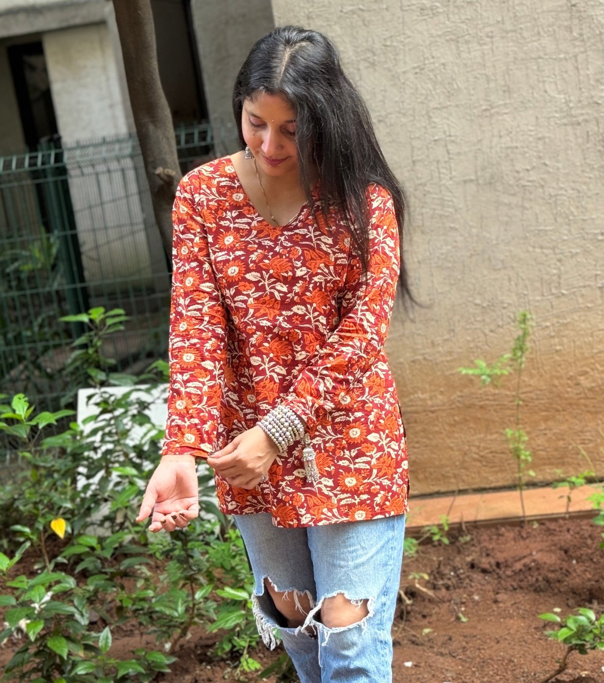 Featuring a V-neckline and full sleeves, the kurti offers a relaxed yet elegant fit. The floral print in warm tones of orange, red, and cream adds a traditional touch, making it suitable for casual outings or festive occasions.